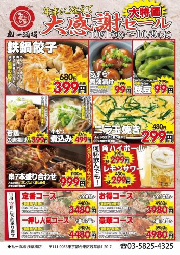 【年末に迎えて大特価大感謝セール!】10月1日(水)~10月9日(木)限定のセールとなっております。定番のおつまみからコースまで!ぜひこの機会にご堪能ください。詳細はチラシにて。